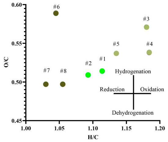 Distribution fields of elemental composition indices in H/C-O/C coordinates of HAs. Green—modern Cryosols; light-brown—MIS 5e deposits; dark-brown—MIS 7 deposits. #1–#8 correspond to Table 2.