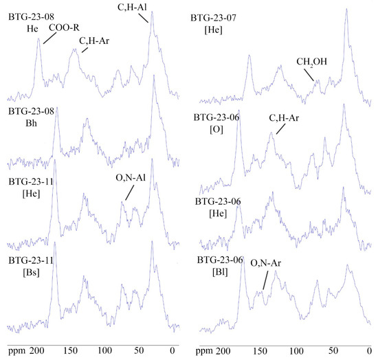 To determine the qualitative composition of HAs, an analysis using 13C-NMR spectroscopy was performed. The obtained spectra are shown in Figure 3, and the results of the analysis are presented in Table 3.