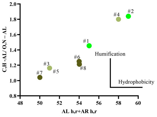 To analyze the parameters of humification and hydrophobicity of HAs, a diagram of integral indicators of HAs was constructed (Figure 4).