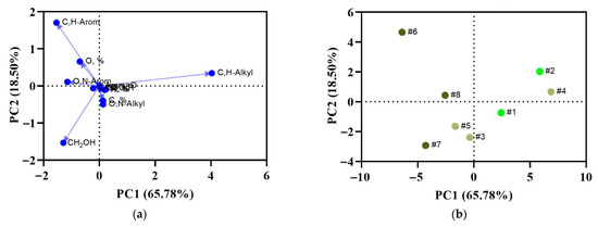 Results of principal component analysis for structural fragments and elemental composition of HAs. Soil IDs correspond to those in Table 1. Green—modern Cryosols; light-brown—MIS 5e deposits; dark-brown—MIS 7 deposits. (a)—Correlation diagram, (b)—Ordination diagram.