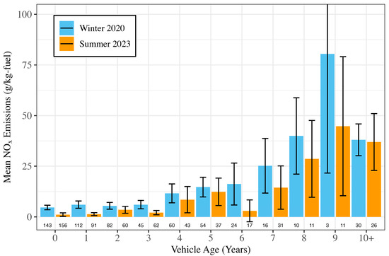 HD diesel vehicles measured during Winter of 2020 have significantly higher NOx emissions than those measured during Summer 2023. Mean NOx emissions and 95% confidence intervals (CI) were calculated for each vehicle age group. The average NOx emissions for the Winter 2020 campaign are 9.1 g/kg-fuel NOx (CI 7.8–10.4), while the Summer 2023 measured average was significantly lower at 5.7 g/kg-fuel NOx (CI 4.2–7.1) (see Table 1, Figure A5). Winter 2020 vehicles have 60% (1.6 times) higher mean NOx emissions than the vehicles measured in Summer 2023.