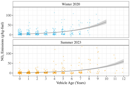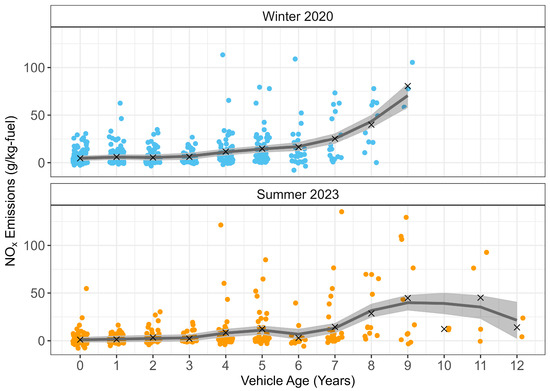 GAM predictions. NOx emission (g/kg-fuel) from the Winter 2020 and Summer 2023 campaigns by vehicle age. The means by age and campaign are displayed with x marks. Smooth mean emission rates by age are predicted using GAMs and shown with the dark gray lines. Shaded light-gray areas are 95% confidence intervals of the mean predicted values from the GAMs.