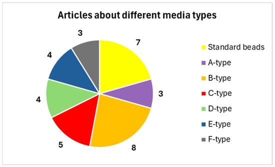 Both standard PVA beads and other types of media can remove pollutants via material degradation (e.g., ammonium to nitrate). However, D and E media can also adsorb various types of pollutants like metals and complex molecules such as dyes. Among all types of media for ammonium and organic compound degradation via microorganisms, B media can remove the highest concentration but with a very high retention time (up to 40 h). In contrast, C media is also capable of significant pollutant removal, yet with much shorter retention times (9.5–12 h). Standard PVA beads, B, and D can also decompose complex compounds like cresols or quinoline. All mentioned media types have great capacity in adsorption or biological cleaning, although most experiments were conducted on a laboratory scale. It is also evident that not all media types have been tested with every compound, indicating that their full potential is not yet thoroughly researched. Further research should focus on the scalability of these media, as well as their removal potential for a range of pollutants. This includes simple biological treatments like nitrification, as well as more complex molecules such as dyes, cresols, and various types of metals.