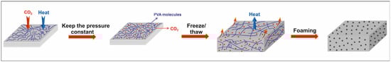 PVA-based foams have been widely explored due to their high porosity and ease of production, yet their application is not common in wastewater treatment. To produce this type of media, constant pressure conditions often followed by freezing/thawing methods to release the added carbonate are required (Figure 2). X. Bai et al. [20] created PVA foams by mixing calcium carbonate powder with PVA in boiling water, followed by adding hydrochloric acid to produce CO2 bubbles. The resulting foam was frozen overnight, cut into small cubes, and treated with NaOH. Similarly, X. Li et al. [21] employed a calcium carbonate–hydrochloric acid method but incorporated a freeze-thaw process for enhanced properties. Abdeen and Mustafa [22] improved foam structure and durability by adding epichlorohydrin for chemical crosslinking.