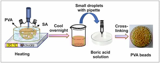 Hydrogels made from PVA and sodium alginate (SA) are quick and efficient to produce (Figure 3). The method utilizes sodium alginate blended with poly (vinyl alcohol), which undergoes thermal treatment to promote hydrogen bonding between the polymer chains. The addition of a chemical crosslinking agent further enhances the mechanical strength and stability of the resulting composite. Often boric acid is used for initiating crosslinking, as Toh et al. [23] used immobilized PVA-Sodium Alginate beads crosslinked with boric acid to degrade o-cresol. Other researchers, such as Zain et al. [24], Lee and Cho [25], and Chou et al. [26], adapted similar methods with varying crosslinking agents to optimize structure and efficiency. Specific applications included immobilizing microorganisms like Pseudomonas putida [27], Nitrosomonas, Nitrobacter [28], and Acinetobacter sp. [29] for wastewater treatment, with each study focusing on improving biodegradation capacities through tailored crosslinking methods.