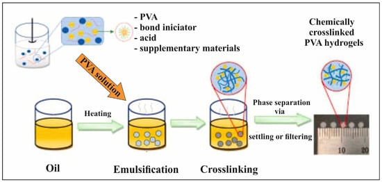 PVA capsules and spheres made via emulsification have shown promise for enhancing activated sludge (AS) systems. They show exceptional small size and pumping capabilities, yet their production method and measurement remain challenging. Their production starter solution, composed of poly (vinyl alcohol) (PVA), water, and various acids to maintain a low pH, is prepared, along with a chemical initiator for crosslinking. This hydrophilic mixture is then poured into an oil phase, where emulsification occurs, forming microcapsules. Within these emulsion droplets, the crosslinking reaction takes place, resulting in the formation of stable PVA beads. Their production (Figure 4) often requires heating, like Guerrero et al. [30], who developed PVA capsules to improve nitrogen removal efficiency, using a high-temperature emulsion process with benzaldehyde and oil. Microcarriers in the micrometre range, such as those developed by Cvetkovic et al. [31], were produced by mixing PVA with AS and dispersing it into a chilled soybean oil phase containing lecithin, resulting in smaller particles with high surface area.