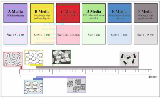 Traditional media carriers typically range in size from 2.2 to 50 mm in length or 9 to 64 mm in width [3,52,53,54,55]. Their SSA values vary between 78 and 5500 m2/m3, with protected surface areas between 66 and 900 m2/m3 [56,57,58,59,60,61]. For PVA-based carriers, while various production methods exist, detailed data on their size and SSA are more limited. These types of media have a wide range of sizes, which we summarized in Figure 8. to demonstrate the difference between the types.