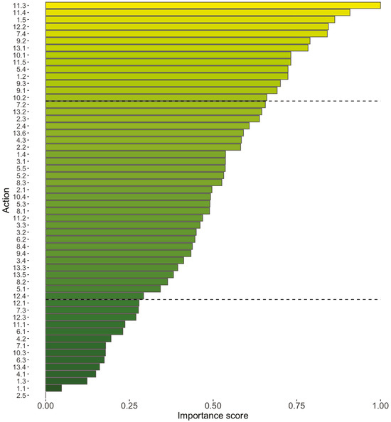 After designing the case study, we trained a classification ML model—Random Forest—and subsequently conducted an importance analysis to identify which actions most significantly influence the level of compliance [62,63,64]. We selected Random Forest among several interpretable models, such as logistic regression, decision trees, and gradient boosting, because it delivers strong predictive and classification performance, resists overfitting, and handles a large number of inputs while modeling complex, nonlinear relationships and interactions among variables. These characteristics make it widely adopted across domains and particularly suitable for our context, where multiple interdependent factors may drive compliance. The importance measures derived from the ML model provide variable importance scores, allowing us to identify which actions most strongly influence compliance classification. These insights support prioritization in training, audits, and policy interventions. Specifically, we used the Mean Decrease Gini coefficient, which quantifies how much each input contributes to reducing node impurity in decision trees. This coefficient is a model-dependent measure because it derives directly from the internal structure and training process. It is less sensitive to fluctuations in predictive performance and more consistent in reflecting how the model uses each variable for classification. Compared to model-independent methods, Mean Decrease Gini is computationally efficient because it does not require retraining or repeated evaluations. It captures the structural contribution of each variable to the classification process and is not directly influenced by predictive accuracy on test data. This is an advantage when the goal is to understand the model’s decision structure rather than validate predictive performance. In our case, which involves identifying and classifying the most relevant actions to support priority setting in training, review, and policy interventions, Mean Decrease Gini provides a practical and interpretable summary of overall importance. To ensure comparability, we normalized the importance estimates globally across all variables to range between 0 and 1 and sorted them in descending order (see Figure 1). This process facilitates easier comparison and interpretation of the results across different thematic areas.