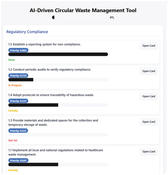 This study proposes an AI-Driven Circular Waste Management Tool designed for the circular management of hospital waste. The system is based on the latest developments in AI applied to document management and regulatory compliance in regulated sectors [18,19,20,21,22]. In this study, we transform qualitative regulatory actions into structured variables and quantify their strategic weight through ML models. This approach enables environmental managers to clearly identify which actions have the greatest impact, facilitating more effective operational planning aligned with the principles of the circular economy. Furthermore, through evaluation models, it helps determine whether the corrective actions taken are genuinely improving the situation. It allows for continuous monitoring of results, ensuring that procedures comply with laws and respect the environment. In this way, the tool facilitates more effective and integrated decision-making, considering not only regulations but also the environmental, health, and organizational impacts. Through simulated case studies, we demonstrate how the AI-Driven Circular Waste Management Tool can improve operational sustainability, ensure regulatory compliance, and effectively implement the principles of the circular economy and the Zero-Waste strategy in hospital waste management.