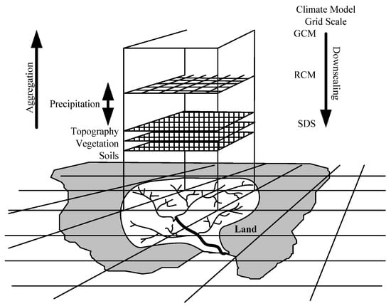 Conceptual diagram of climate downscaling: converting global-scale model data into local-scale climate information. The figure shows aggregation and disaggregation processes across spatial scales. GCM (Global Climate Model), RCM (Regional Climate Model), and SDS (Statistical DownScaling) represent different levels of climate modeling and downscaling approaches. Inputs such as precipitation, topography, vegetation, and soils affect land surface processes at finer resolutions [14].