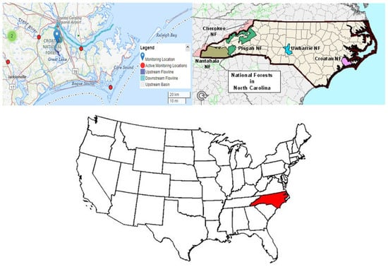 Maps showing the study area. (Top left) Location of the Croatan National Forest (CNF) and hydrology monitoring stations. (Top right) Distribution of the four National Forests in North Carolina, including the CNF in the coastal region highlighted in pink. (Bottom) Location of North Carolina highlighted in red within the United States. River Bend is indicated by the green dot labeled with the number 2 [42].