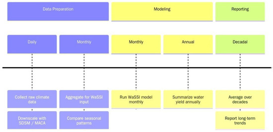 Climate variables (precipitation and temperature) were spatially downscaled at a daily resolution using the SDSM and MACA models. However, since the WaSSI model requires monthly inputs and is sensitive to seasonal climate changes, these daily data were aggregated to a monthly scale. The selection and comparison of the downscaled climate data were performed at the monthly level to accurately capture seasonal hydroclimatic patterns. The WaSSI model was then run using these monthly inputs to simulate water yield at both monthly and annual scales. Although the model can produce outputs at finer resolutions, this study reports only annual results averaged over decades to emphasize long-term climate trends and minimize year-to-year variability. See Figure 3 for the modeling workflow.