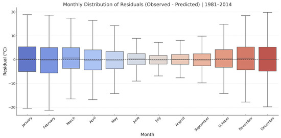 The SDSM was calibrated using observed climate data from 1981 to 2014 to develop robust statistical relationships for temperature downscaling. Through iterative testing, specific humidity and 500 hPa geopotential height were identified as the most effective large-scale atmospheric predictors from the NCEP-DOE daily dataset. These variables consistently showed strong correlations with local temperature across all months. The calibration process yielded high model performance, with an average R2 of 0.75, and values exceeding 0.83 in certain months such as November and December. Additionally, Durbin–Watson statistics were consistently close to 2.0, indicating minimal autocorrelation in the residuals and confirming the statistical reliability of the model outputs [63]. Overall, the selected predictors and calibration results demonstrate that the SDSM can provide accurate and dependable localized temperature projections when properly configured. In the next step, to validate the model, temperature data for the period 2015–2022 were generated using the SDSM with predictors obtained from GCMs. The analysis of model performance during the calibration and validation periods indicates behavioral stability and satisfactory generalizability to independent datasets. As illustrated in Figure 4, during the calibration period (1981–2014), the distribution of monthly residuals was largely centered around zero, suggesting high model accuracy in reproducing temperature patterns, particularly in the summer season. Although greater variability in residuals is observed during the colder months, the overall trend remains consistent. A similar performance pattern is evident in the validation period (2015–2022), as shown in Figure 5, where the model successfully captures seasonal temperature fluctuations and maintains an acceptable level of predictive accuracy. The relative consistency of the model’s behavior across both periods confirms the coherence of the outputs and affirms the model’s reliability under varying temporal conditions. The final step involved generating future temperature projections for the period 2023–2060 using GCM-based predictors through the Scenario Generator module of SDSM.