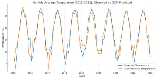 Comparison of observed and GCM-based simulated monthly average temperatures during the validation period (2015–2022).
