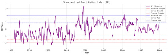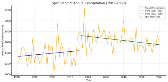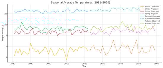 The temperature in the CNF has increased steadily from 1981 to 2022, and is projected to continue increasing to 2060, showing clear signs of climate warming. As shown in Figure 6, the average annual temperature rose by 0.121 °C per decade during 1981–2022 and is projected to rise faster 0.187 °C per decade between 2023 and 2060. Temperature variability also increased over time, with more extreme heat events and warm nights (Figure 6).