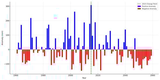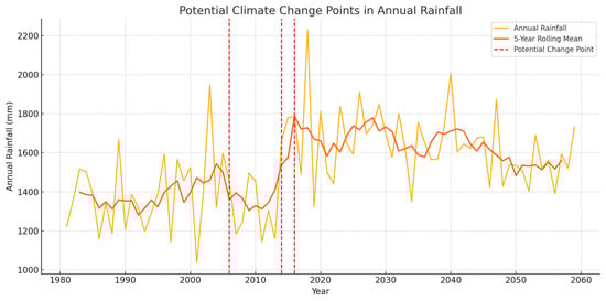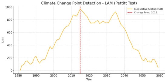 Climate change point detection using the Pettitt test [64] applied to temperature data, showing a statistically significant change around 2015. The orange line represents the cumulative statistic , defined as the maximum absolute value of the rank-based cumulative sum of differences between two segments of the time series. The peak of , marked by the red dashed line, identifies the most probable change point, implying a shift to a new climatic phase relevant to evapotranspiration and water yield modeling.