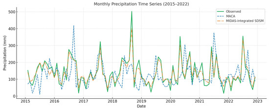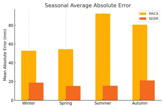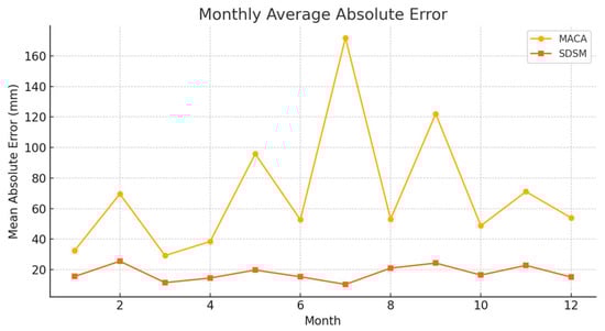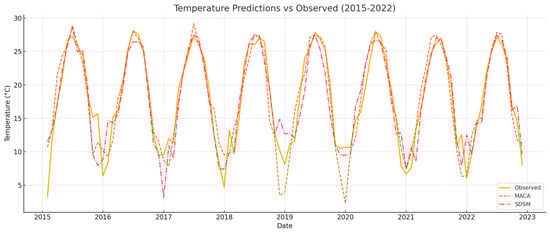 In this section, the performance of these two statistical temperature prediction models was evaluated using observational data from 2015 to 2022. Based on the error metrics in Table 4, the SDSM had the lowest Mean Absolute Error (MAE = 1.80 °C), and Root Mean Square Error (RMSE = 2.56 °C), as well as a higher coefficient of determination (R2 = 0.866), showing better overall accuracy compared to MACA. The time-series trend (Figure 10) further confirms that the SDSM more accurately follows the seasonal patterns of observed temperatures.
