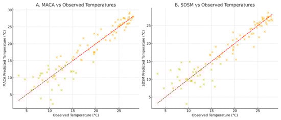 (A,B) Comparison between observed temperatures and those predicted by MACA (A) and SDSM (B). Each orange cross (×) represents an individual observed–predicted temperature pair. The red dashed line indicates the 1:1 line, representing perfect agreement between observed and predicted values.