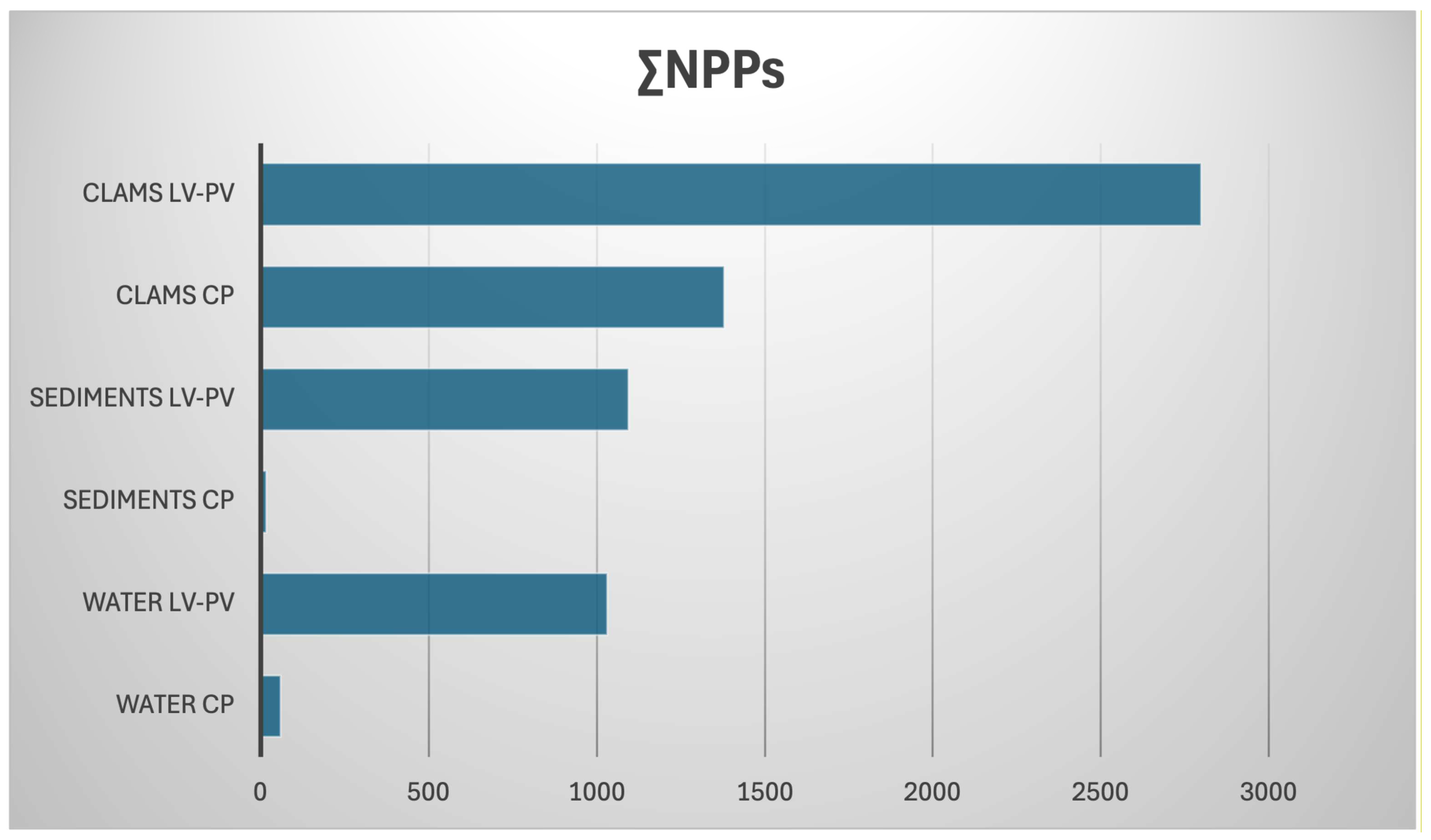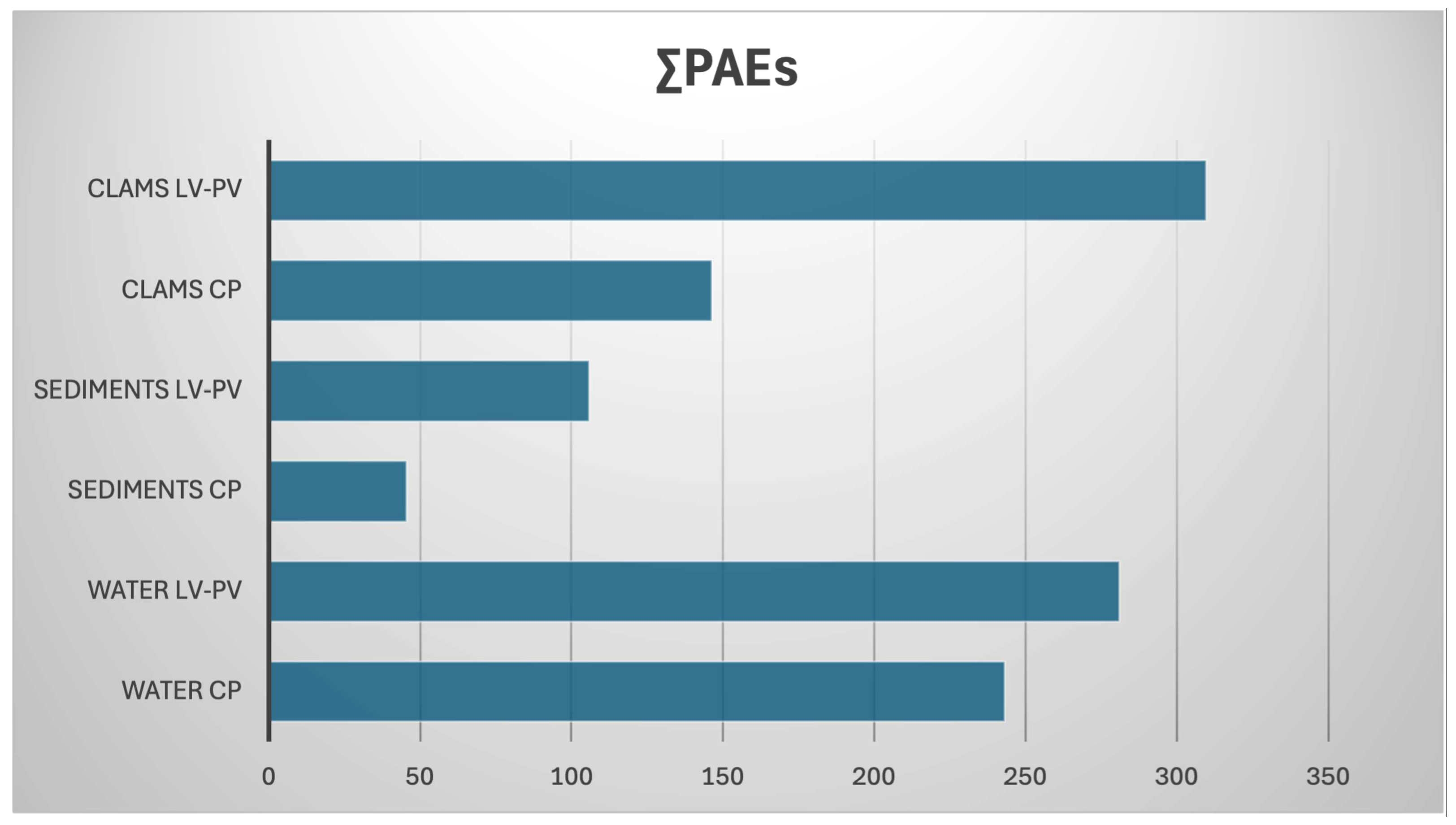 3.1. Occurrence of PAEs and NPPs in Clam, Water, and Sediments