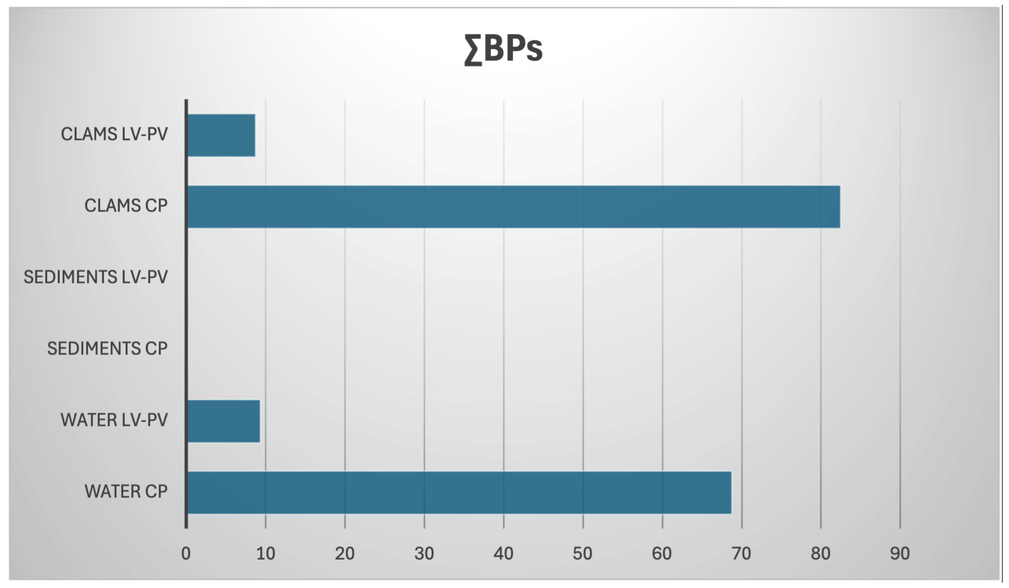 3.2. Occurrence of BPs in Clam, Water, and Sediments