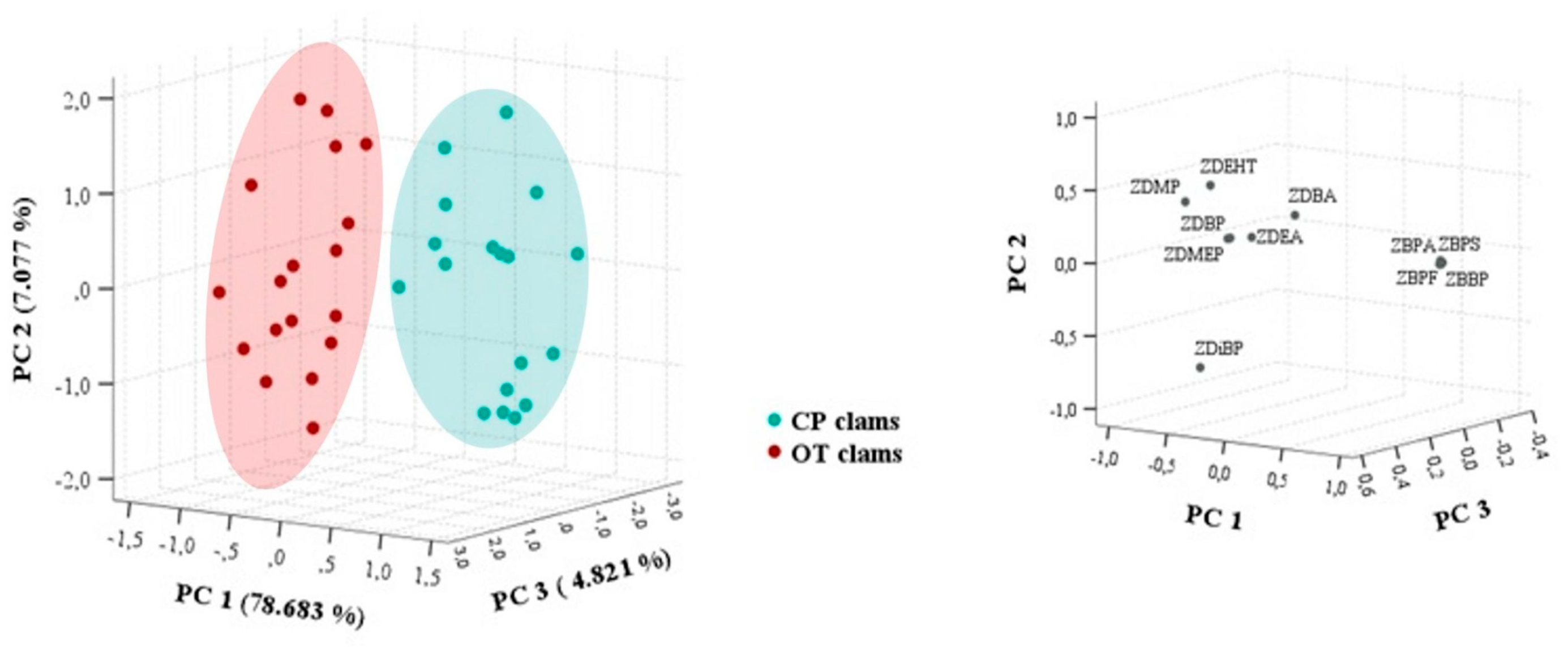 - Castellani, F.; Vitali, M.; Antonucci, A.; Del Morrone, G.; Cofone, L.; D’Ancona, G.; Protano, C. Bisphenols and phthalates contamination in edible mussels (Mytilus galloprovincialis) from central Italy coastline: Occurrence, spatial distribution, and human health risk assessment. J. Food Compos. Anal. 2025, 139, 107174. [Google Scholar] [CrossRef]