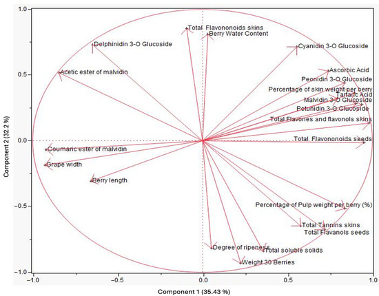 The PCA analysis plot illustrates the distribution of various grape-related parameters across the first two principal components, which explain 35.4% and 30.27% of the total variance, respectively (Figure 3). PCA analysis revealed clear clusters of variables that are correlated with each other. For example, high concentrations of phenolic compounds and anthocyanins are associated with samples that have high antioxidant potential. In contrast, variables related to the physical structure of the fruit (e.g., size) move in the opposite direction, indicating that “larger” grapes may have lower concentrations of bioactive compounds (Figure 3).