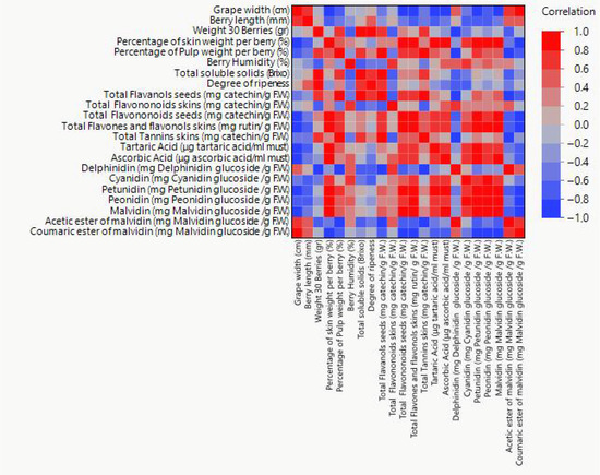 The most important correlations between certain pairs of variables considered to be of significant viticultural importance are presented in Figure 4. All the correlations shown are the result of paired comparison analysis, with the selection of those correlations that exhibit a strong positive or negative relationship (p < 0.0001). Positive correlations are indicated in red, while negative correlations are indicated in blue. Color intensity indicates the strength of the correlation.