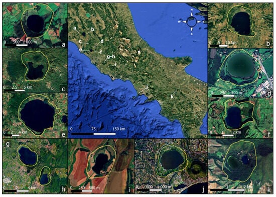 Study area including the main Italian volcanic lake calderas. The letters (a–k) correspond to each caldera. The limit of each caldera is defined by a yellow line ((a) = Mezzano, (b) = Bolsena, (c) = Vico, (d) = Monterosi, (e) = Bracciano, (f) = Martignano, (g) = Albano, (h) = Nemi, (i) = Giulianello, (j) = Averno, (k) = Monticchio). Base map is Google Maps 2025 (C).