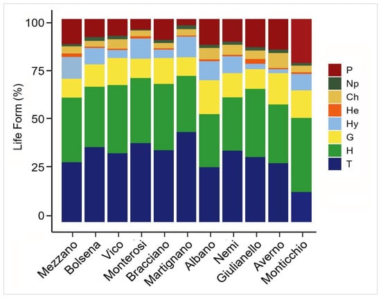 The life form spectrum calculated on the total flora of the volcanic calderas showed a nearly equal proportion of therophytes and hemicryptophytes, resulting in an H/T ratio close to 1. This pattern reflects a Mediterranean bioclimate with significant oceanic to subcontinental influences, likely shaped by climatic and altitudinal gradients across the examined calderas (Table 1). However, when analyzing each caldera, notable variability in H/T ratios emerges, highlighting distinct microclimatic as well as environmental conditions. In particular, the higher H/T ratio observed at Monticchio is typical of well-preserved Apennine forest areas, as in the case of Casentino National Forest Park [] and the Alpe della Luna [], whereas the high proportion of therophytes in the calderas of Martignano and Nemi is likely linked to the presence of open habitats and significant environmental instability associated with anthropogenic disturbance, which favors the establishment of short-lived species [,,].