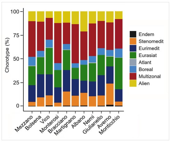Chorological spectrum for each caldera. Endem = Italian endemics, Stenomedit = Stenomediterraneans, Euromedit = Euromediterraneans, Eurasiat = Eurasiatics, Atlant = Atlantics, Boreal = Boreals, Multizonal = Multizonals, Alien = alien plant species.