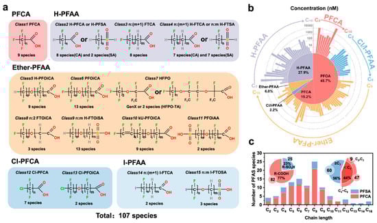 - Han, D.; Ma, Y.; Huang, C.; Zhang, X.; Xu, H.; Zhou, Y.; Liang, S.; Chen, X.; Huang, X.; Liao, H. Occurrence and source apportionment of perfluoroalkyl acids (PFAAs) in the atmosphere in China. Atmos. Chem. Phys. 2019, 19, 14107–14117. [Google Scholar] [CrossRef]