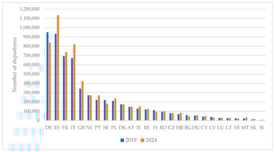 Figure 1 also represents the relative relevance of each country in terms of departure volumes. In 2019, the countries with the highest number of departures were Germany (16.55%), Spain (16.26%), and France (12.08%). In 2024, the situation changed, with Spain leading (18.32%), followed by Germany (13.54%) and Italy (13.28%). The top three countries accounted for 44.89% of the total flights in 2019, increasing slightly to 45.14% in 2024, which shows a high level of concentration of the European network and centralization trend. It is interesting to note that Germany was the only one of these key countries that decreased the number of flights, as will be discussed later.