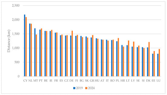 Evolution of the average flight distance in each EU country between 2019 and 2024.