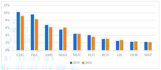 Only seven of these main airports belonged to the top ten airports in terms of supply, as observed in Figure 5. Over the period, the combined supply of these airports went from 50.35% to 47.82% of the region’s total, pointing towards a reduction in the traffic concentration. In 2019, Paris Charles de Gaulle accounted for 10.2% of the total fuel loaded in the EU, followed closely by Frankfurt am Main with 9.5%. Then, the third airport in the classification was Amsterdam Schiphol, with 6.7%. In total, they supplied 26.5% of the total amount of fuel, which highlights the level of centralization in the region. In 2024, Paris Charles de Gaulle remained as the top airport but saw its share drop to 9.1%. It was followed again by Frankfurt am Main with 8.3% and Amsterdam Schiphol with 6.2%, bringing their combined share down to 23.6%. Only Madrid, Lisbon, and Dublin airports increased their relative relevance in terms of fuel supply during these years.