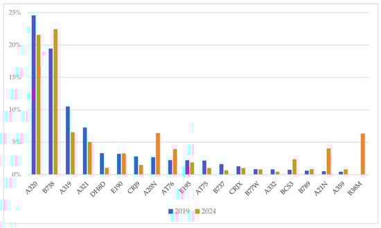 Variation in the percentage of flights operated by some of the most popular aircraft models in 2019 and 2024.