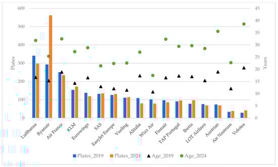 Evolution of the number of plates and average fleet age for the main airlines in scope between 2019 and 2024.