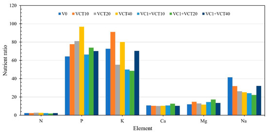 When the ratio of soybean leaf nutrient concentration to residual soil nutrient concentration was calculated (Figure 1), distinct patterns in nutrient uptake efficiency were observed. In V0 treatment, K and P uptake efficiencies were relatively high despite low absolute nutrient content. Increasing VCT concentration enhanced P and K uptake efficiency, with VCT40 showing the highest P ratio (96.8) and a high K ratio (80.0). N uptake ratios remained relatively stable across VCT-only treatments (2.3–2.7) while VC+VCT treatments generally reduced K uptake efficiency, with the lowest values in VC1+VCT20 (48.6) and VC1+VCT10 (50.0). P uptake ratios followed a similar trend, remaining high in VC1+VCT20 but not surpassing those in VCT-only treatments. Mg uptake efficiency peaked in VC1+VCT20, while Na uptake efficiency was highest in V0 and VC1+VCT40 (Figure 1).