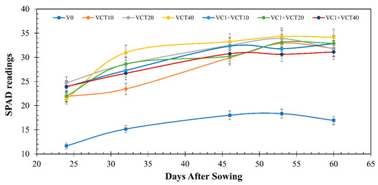 SPAD measurements showed a general increase in leaf chlorophyll content with advancing plant maturity across all treatments (Figure 2). Across all sampling dates, the control treatment (V0) consistently recorded significantly lower SPAD values compared to both VCT-only and VC+VCT treatments. SPAD readings in V0 ranged from 11 to 15 throughout the experiment, showing minimal fluctuation. No significant differences were observed between VCT-only and VC+VCT treatments, except in the case of VCT40, which showed marginally higher readings from 32 to 60 DAS.