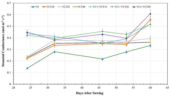 Stomatal conductance increased over time across all treatments (Figure 3), reflecting progressive canopy development and rising photosynthetic demand. The highest conductance values were observed in VC+VCT treatments, particularly VC1+VCT20 and VC1+VCT40, suggesting that the combination of slow-release nutrients from VC and bioactive compounds in VCT created an optimal soil environment for root development and water uptake. This likely enhanced the plants’ ability to regulate stomatal opening, a process closely linked to water availability, nutrient status, and overall physiological vigor [46,50].