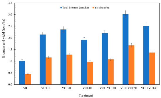 Notably, VCT20 outperformed VC1+VCT10 in biomass, indicating that optimal VCT rates can rival combined treatments under certain conditions. However, VCT40 yielded significantly less biomass and grain yield than other amended treatments, suggesting that high concentrations may lead to nutrient imbalances, reduced uptake efficiency, or mild phytotoxic effects [22]. These findings align with prior research, which shows that the benefits of VCT are concentration-dependent and may plateau or decline at an excessive rate [16].
