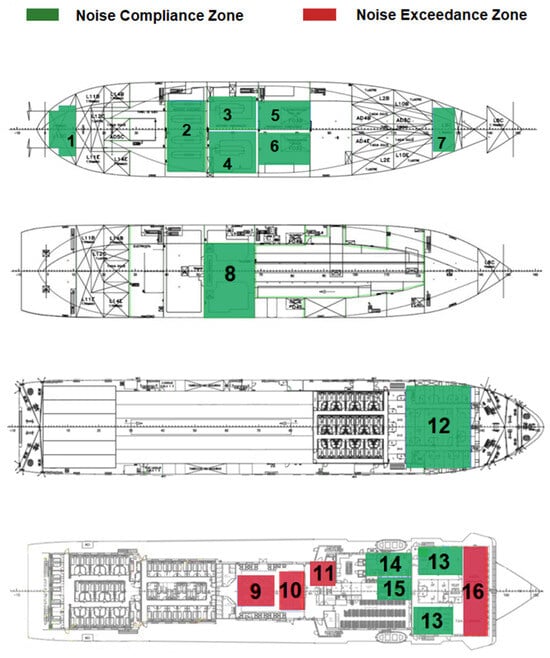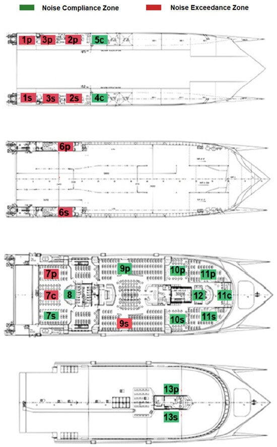 While Figure 1 and Figure 2 provide schematic layouts of measurement points, the representative numerical values are detailed in Table 3 and Table 4 and were used to calculate daily exposure levels (LEX,8h). Comprehensive noise mapping analyses for high-speed craft, including validated numerical sound maps, are available in a previous study by the authors [9].