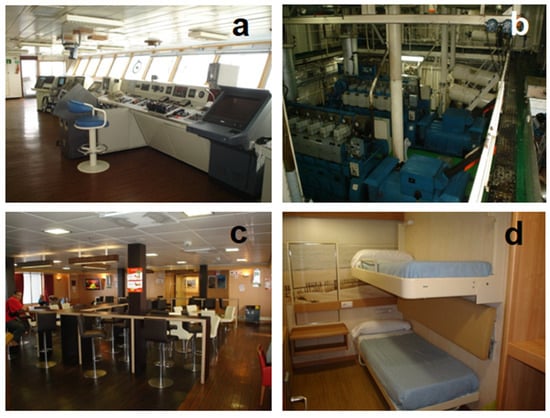 Representative measurement zones onboard the Ro-Pax ferry and HSC, including (a) navigation bridge, (b) engine room, (c) lounge, and (d) crew cabins.
