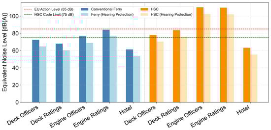 Consistent with previous research [9], the highest recorded noise levels occurred in machinery spaces, particularly aboard the HSC, where values consistently exceeded 110 dB(A). These levels breach the thresholds outlined in IMO Resolution A.468(XII) and exceed the exposure action values defined in the European Directive 2003/10/EC, even after accounting for the attenuation provided by hearing protection. While these regulations are not always explicitly harmonized, their combined application illustrates a critical distinction: IMO standards address design-based noise limitations by area, whereas EU legislation focuses on actual exposure and risk prevention.