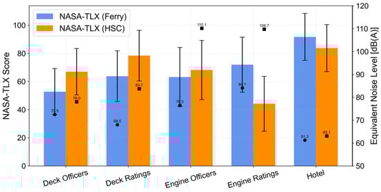 Figure 6 shows the SOFI scores for the conventional ferry and the HSC, alongside their respective equivalent noise exposure levels (LEX,8h). The results reveal a nuanced relationship between perceived fatigue and noise exposure that varies by department.