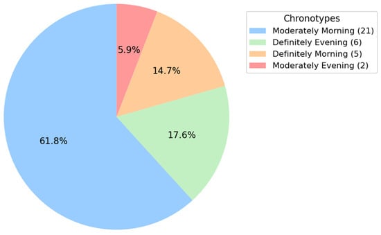 Across the combined sample of 36 participants described in Section 3.2.2, two responses were excluded due to missing data, resulting in 34 valid entries. The majority of respondents exhibited a morning-oriented chronotype, with 61.8% classified as moderately morning and 14.7% as definitely morning. A smaller proportion reported an evening orientation, with 5.9% classified as moderately evening and 17.6% as definitely evening (Figure 7).