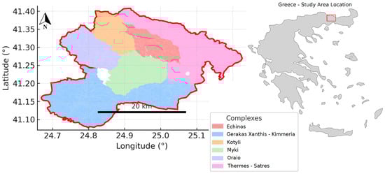 The research area comprises pure oak (Quercus spp.) stands within the jurisdiction of the Forest Service of Xanthi in northeastern Greece (Figure 1). These stands are dominated by Quercus frainetto Ten., Q. petraea (Matt.) Liebl., Q. pubescens Willd., and Q. cerris L. [26]. These stands belong to public forest complexes: Thermes–Satres [27], Echinos [28], Kotyli [29], Myki [30], Oraio [31], and Gerakas Xanthis–Kimmeria [32].