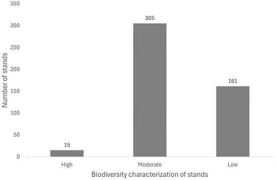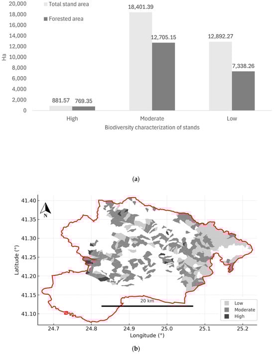 There were fewer high-biodiversity stands than moderate (3.1% vs. 63.4%; Z = −19.84, p < 0.001) or low (3.1% vs. 33.5%; Z = −12.18, p < 0.001), while moderate exceeded low (63.4% vs. 33.5%; Z = 9.29, p < 0.001). From the 481 analyzed stands, 15 (3.1%) stands were characterized as having high biodiversity (high-biodiversity stands), 305 (63.4%) were characterized as having moderate biodiversity (moderate-biodiversity stands), and 161 (33.5%) were characterized as having low biodiversity (low-biodiversity stands) (Figure 2). Moreover, from the 32,175.22 ha of the total area of stands, 881.57 ha (2.7%) were in high-biodiversity stands, 18,401.39 (57.2%) were in moderate-biodiversity stands, and 12,892.27 (40.1%) were in low-biodiversity stands, while from the 20,812.76 ha of the forested area of stands, 769,35 ha (3.7%) were in high-biodiversity stands, 12,705.15 (61.1%) were in moderate-biodiversity stands, and 7338.26 (35.3%) were in low-biodiversity stands (Figure 3a). Figure 3b displays the study area map divided into the three previously described biodiversity levels. The breadth of each gray shade reflects the total area of stands (ha) within that biodiversity level, with the exact values provided in Figure 3a.