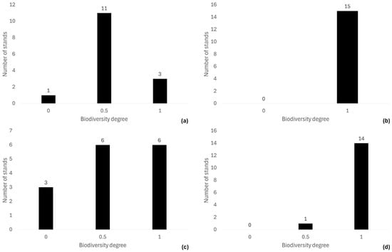 Degrees of stands based on the total amount of wood stock, tree age structure, canopy density, and regeneration existence in stands with high biodiversity. Attribute profile of high-biodiversity stands (n = 15) by GBA parameter. Wood stock (m3/ha) (a): degree 0 (<100) = 1 stand; 0.5 (100–250) = 11; 1 (>250) = 3. Age structure (b): 100% uneven-aged (degree 1). Canopy density (per lower/upper bounds) (c): 0 (<1, <1) = 3; 0.5 (<1, ≥1) = 6; 1 (≥1, ≥1) = 6. Regeneration (d): 0.5 = 1; 1 = 14 (degree coding as defined in Methods).