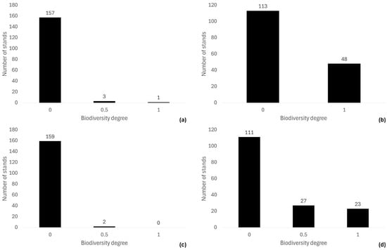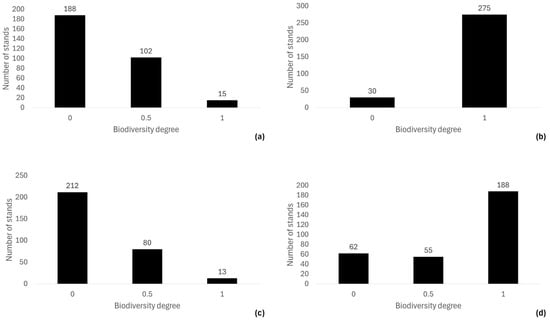 Attribute profile of low-biodiversity stands (n = 161). Wood stock (a): degree 0 = 157; 0.5 = 3; 1 = 1. Age structure (b): even-aged (0) = 113; uneven-aged (1) = 48. Canopy density (c): 0 = 159; 0.5 = 2; 1 = 0. Regeneration (d): 0 = 111; 0.5 = 27; 1 = 23 (degree coding as defined in Methods).