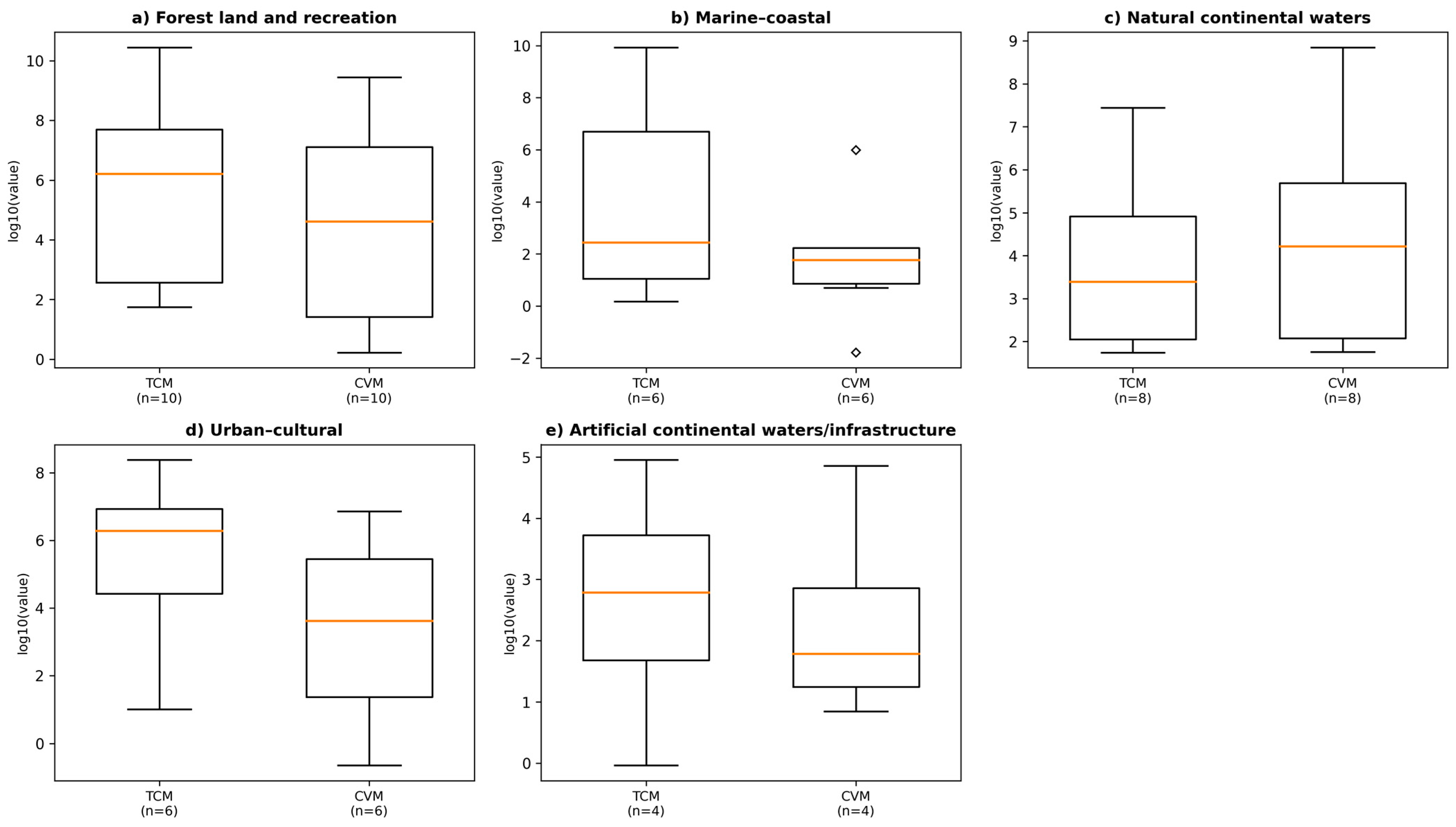 | Artificial continental waters/infrastructure | 4 | Contingent Valuation | 1.80 × 104 | 8.96 × 101 | 7.03 × 100 | 7.17 × 104 | 3.58 × 104 | 1.94 × 101 | 1.81 × 104 | 1.80 × 104 |